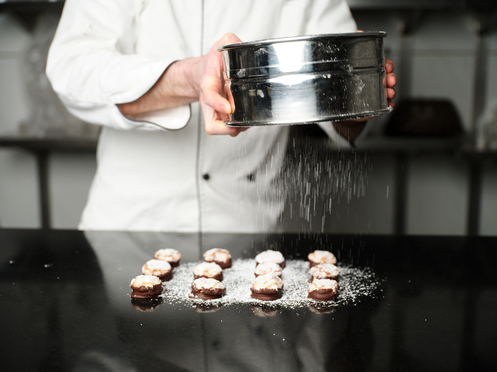 Noch heute werden Freytag-Amaretti nach diesen Rezepten in sorgfältiger Handarbeit aus feinsten Zutaten gefertigt. Das traditionelle Mandelgebäck wird umhüllt mit edlen Schokoladen, harmonisch abgerundet mit einer delikaten Butter-Crème – und verfeinert mit einem Schuss «edlem Wasser».